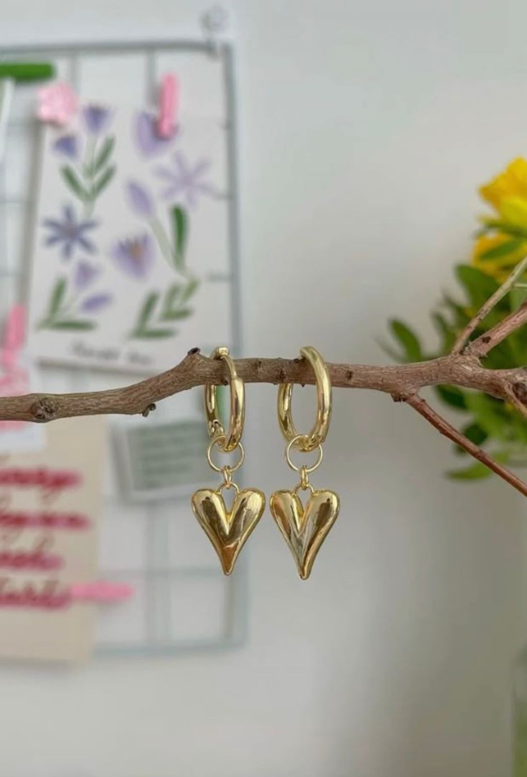 Elegant golden drop earrings featuring a delicate heart design. Lightweight and versatile, they bring a romantic touch to both casual and special outfits. A perfect piece to express love and style.